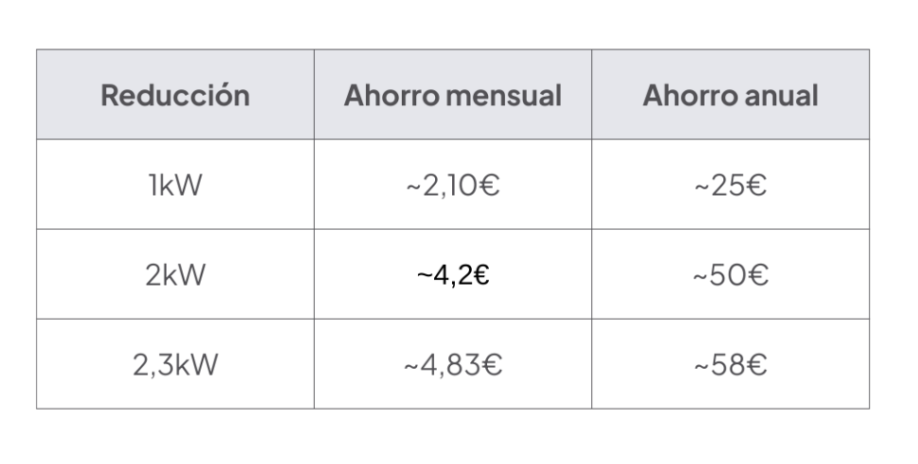 Cada kW que reduces te ahorra aproximadamente 2,10€ al mes, unos 25€ al año por kW. El ahorro es inmediato desde el primer mes y continúa durante todos los meses siguientes.